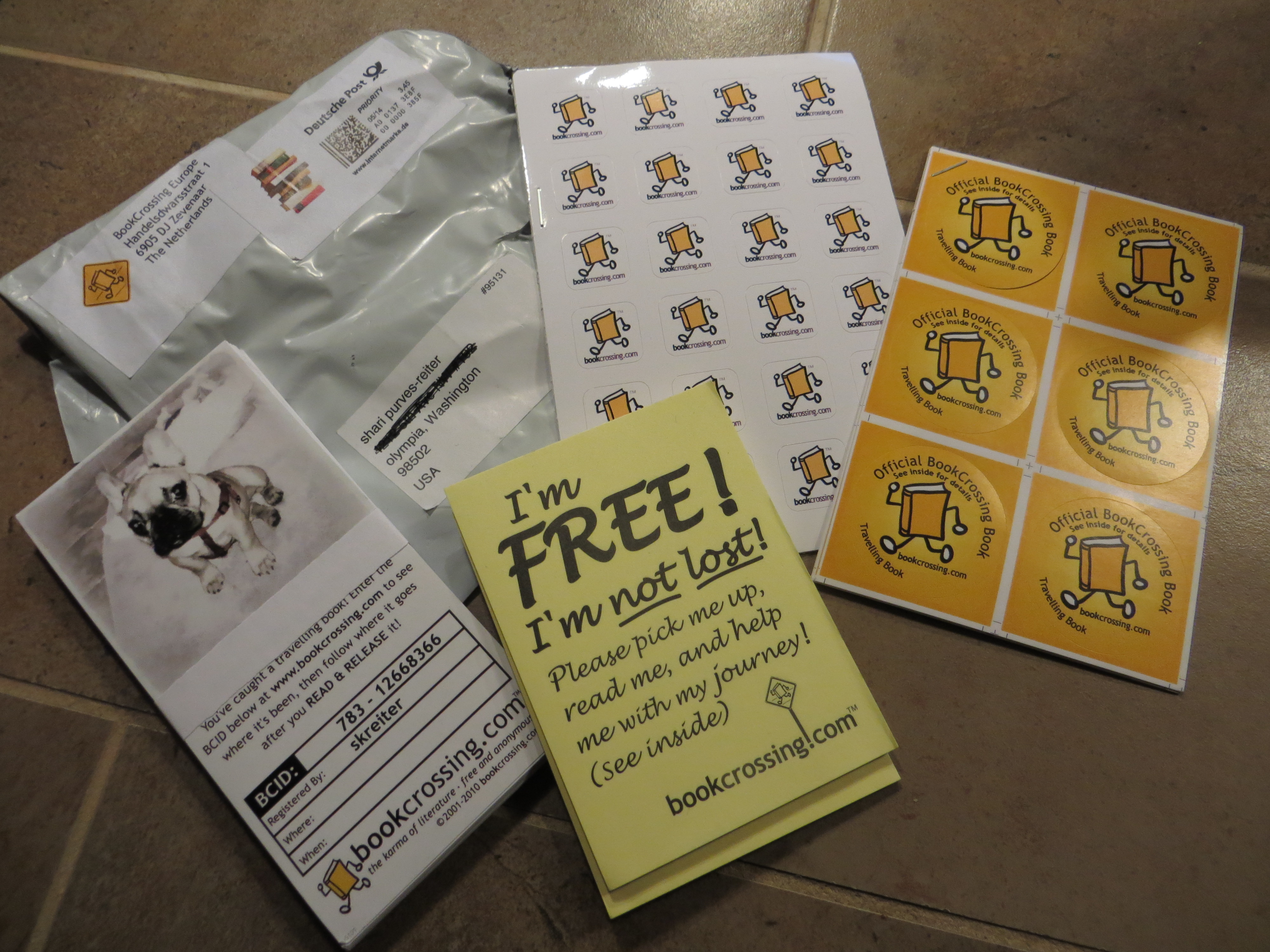 My book-plates and other BookCrossing tools finally arrived and I am so excited to release my first book. I couldn’t understand why it was taking so long, until the package arrived from BookCrossing Europe in the Netherlands. I thought it was coming from Sandpoint, Idaho where the site was started and runs.
